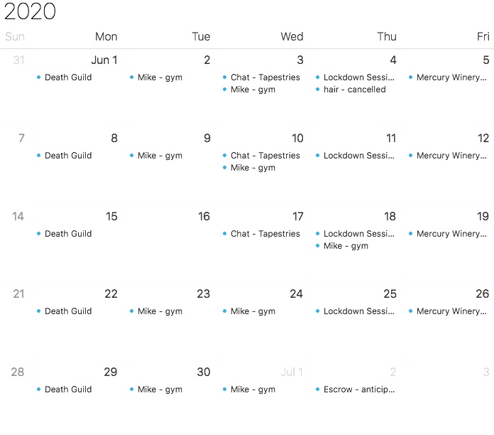 This is my June, 2020 calendar. I had events or tasks scheduled for each day Monday through Friday. No “blursdays” for me!