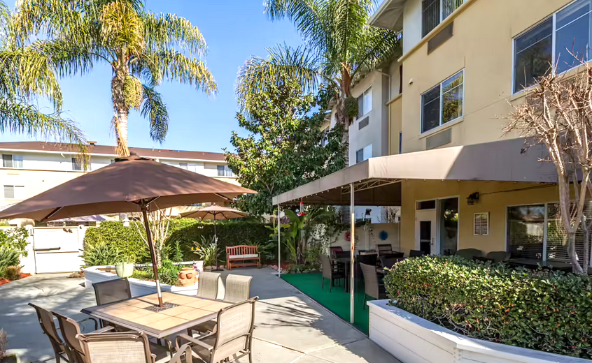 A courtyard of a large building shows tables with umbrellas, a covered patio, and palm trees.