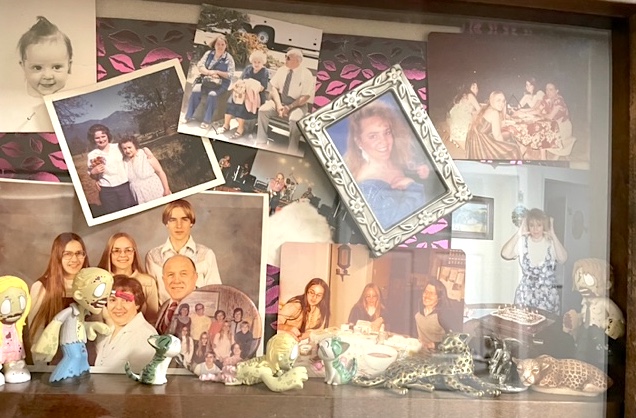 Before my partner and I headed back home, I had one more thing planned to take care of for Peggy. Outside each of the memory care resident’s bedrooms is a little shadowbox, and the staff had asked me to find photos and little mementos to put inside hers that would help remind Peggy of her past. So on this visit, I brought a range of family photos—plus some little models of iconic characters from The Walking Dead, like a little zombie girl with her teddy bear. Peggy really liked that show, and she still could sort of follow the plot, as messy as it was.