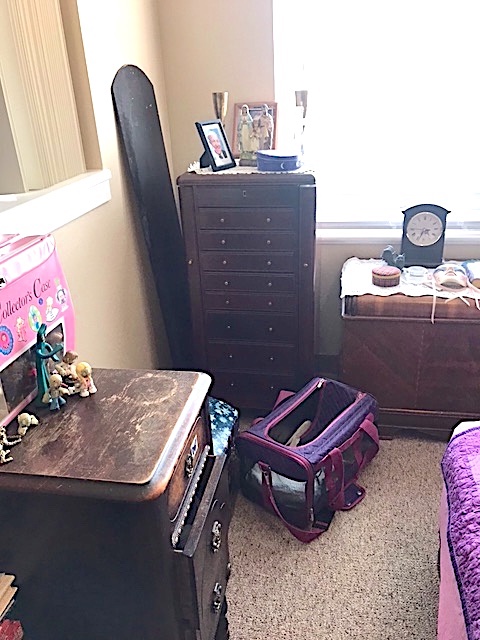 This was Peggy’s bedroom in assisted living. The tall piece of furniture is our mom’s armoire, with her cedar chest next to it. See the large cutout in the wall to the left?